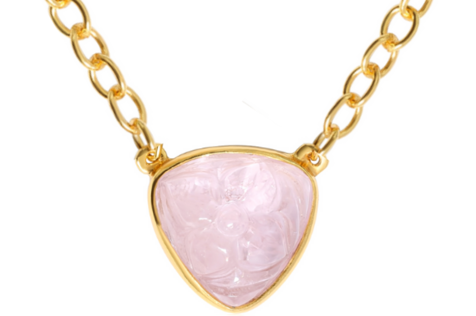 An organically shaped pendant necklace set with a carved morganite gemstone.