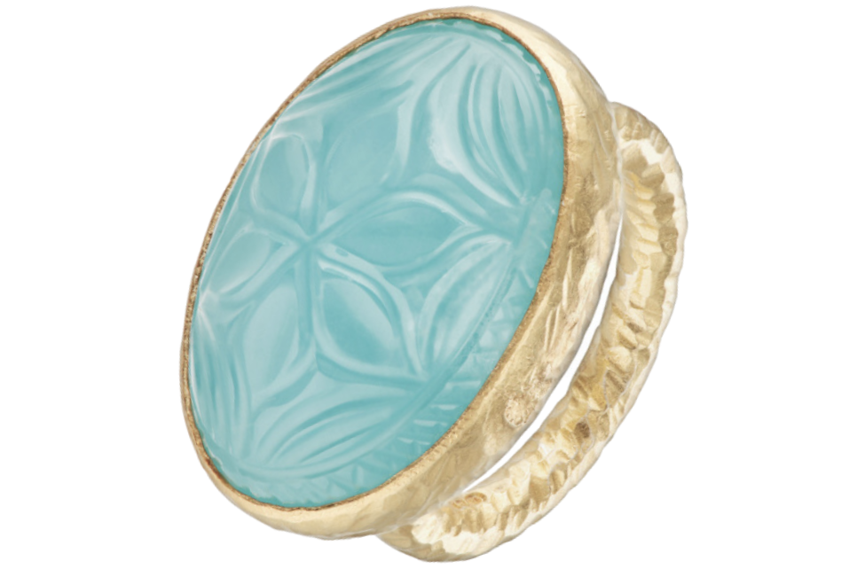 This is a beautiful, one of a kind ring set with a stunning hand carved aquamarine gemstone.