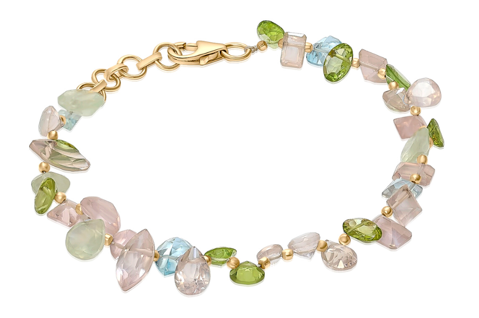 A distinctive gemstone bracelet beaded with a lovely pastel combination of gemstones. The faceted gemstones used in these pieces are a random mix of shapes and sizes giving the bracelet an individual charm.