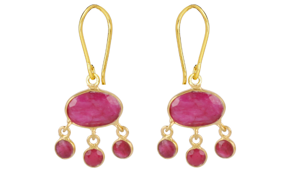 Our super popular Jellyfish Earrings seen here set with ruby red sillimanite. The gemstones are simply set with a frame around them and the hanging stones move prettily when worn.