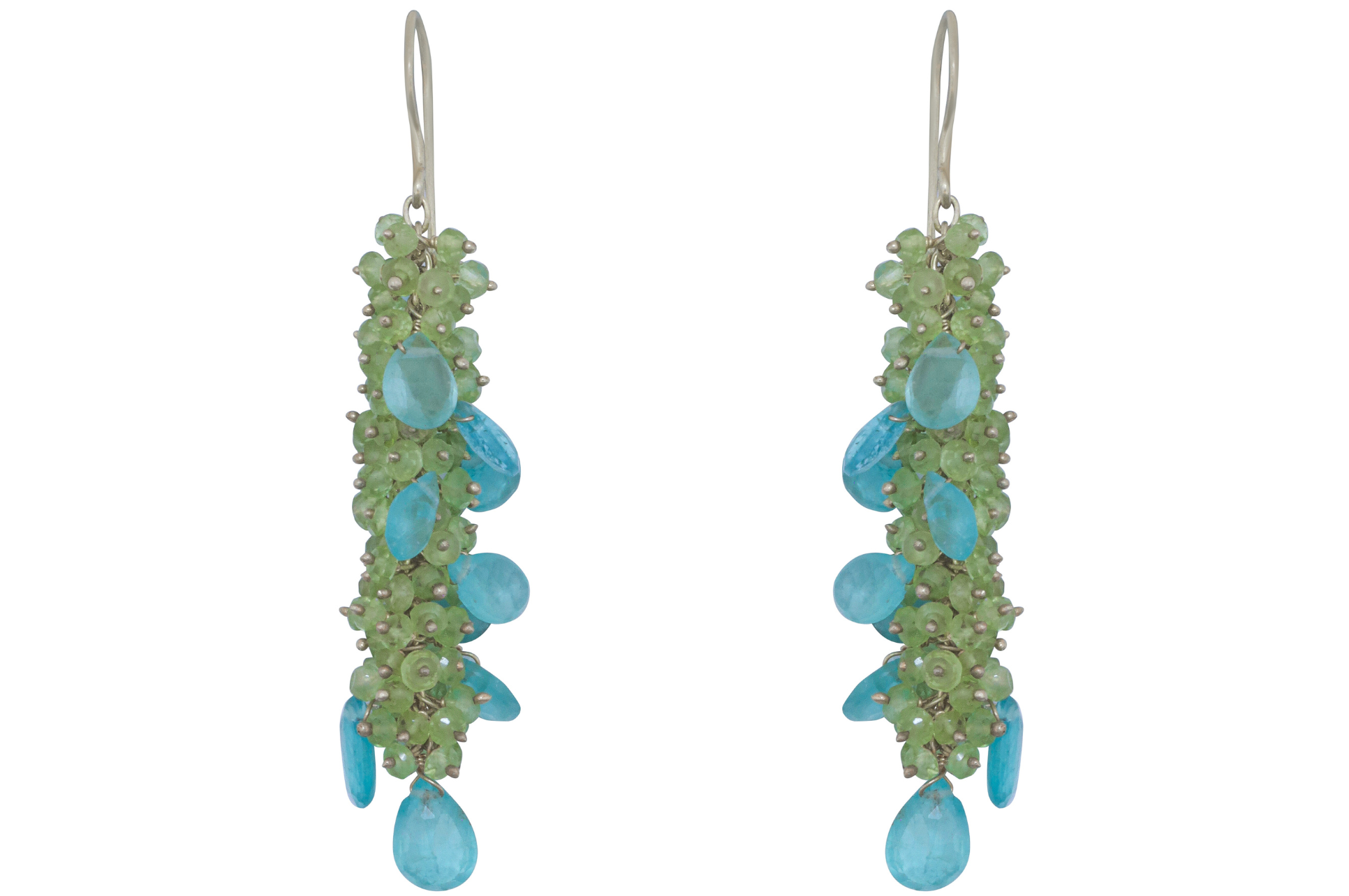 Intricately beaded jewellery - one of our most favourite things.  A feat of craft and patience, these earrings are a cluster of apple green peridot gemstones, interspersed with apatite gemstones.