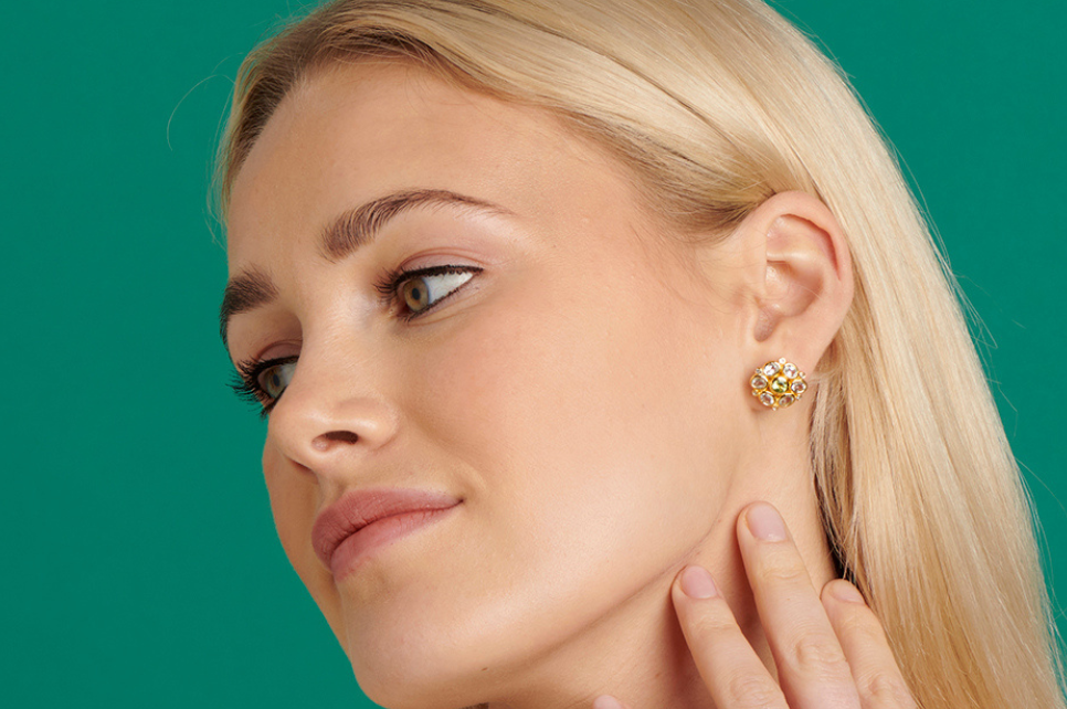 Stunning, stud earrings set with green amethyst and peridot gemstones in a floral motif.  View all of our Posie Gemstone Jewellery Collection.