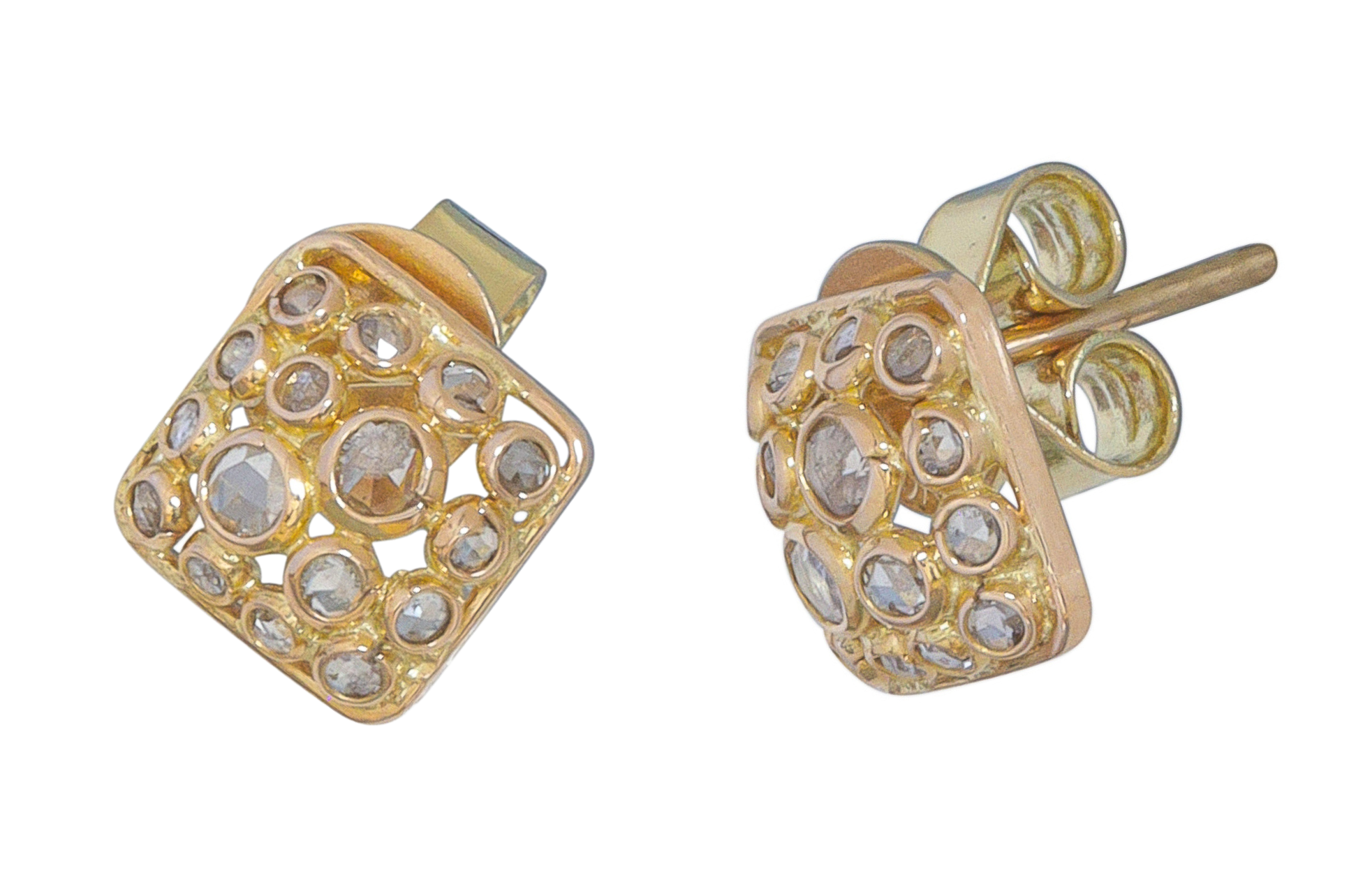These cushion-shaped stud earrings are set in 18K solid gold and embellished with diamond gemstones. Ellie wears these earrings with the matching Alcazar Diamond Ring.