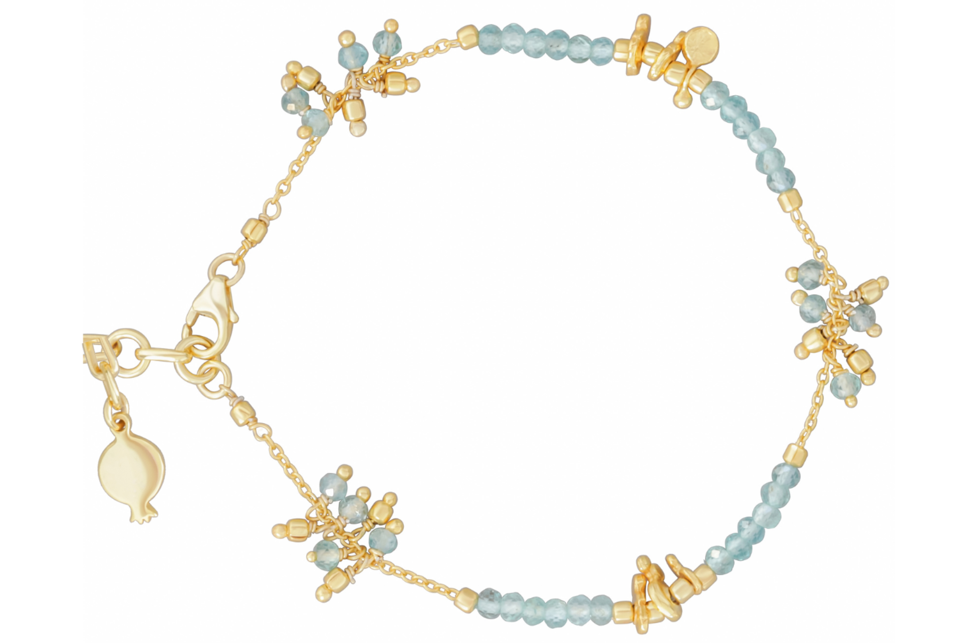 Ella is a pretty bracelet with beaded and chain sections, adorned with hanging beads and gold charms.