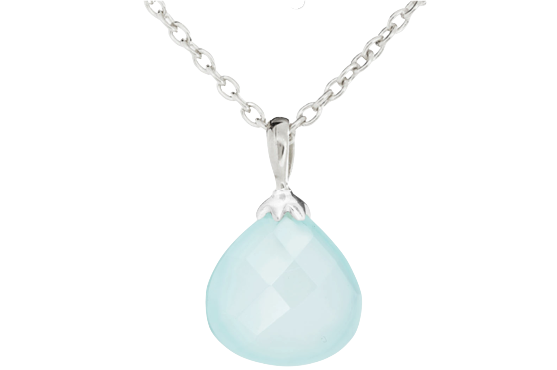 Our much loved, elegant Hera Gemstone Pendant Necklace. This necklace is set with a pear-shaped, chalcedony gemstone. Harriet wears the green amethyst version of this necklace.