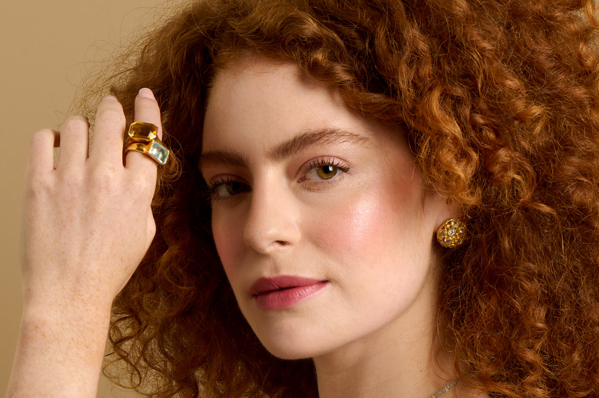 One of the latest rings from our India Ring Collection, featuring vibrant, coloured gemstones encased in precious metals. This fabulous gemstone ring is worn with a citrine version of this ring style and our Cupola Stud Earrings.