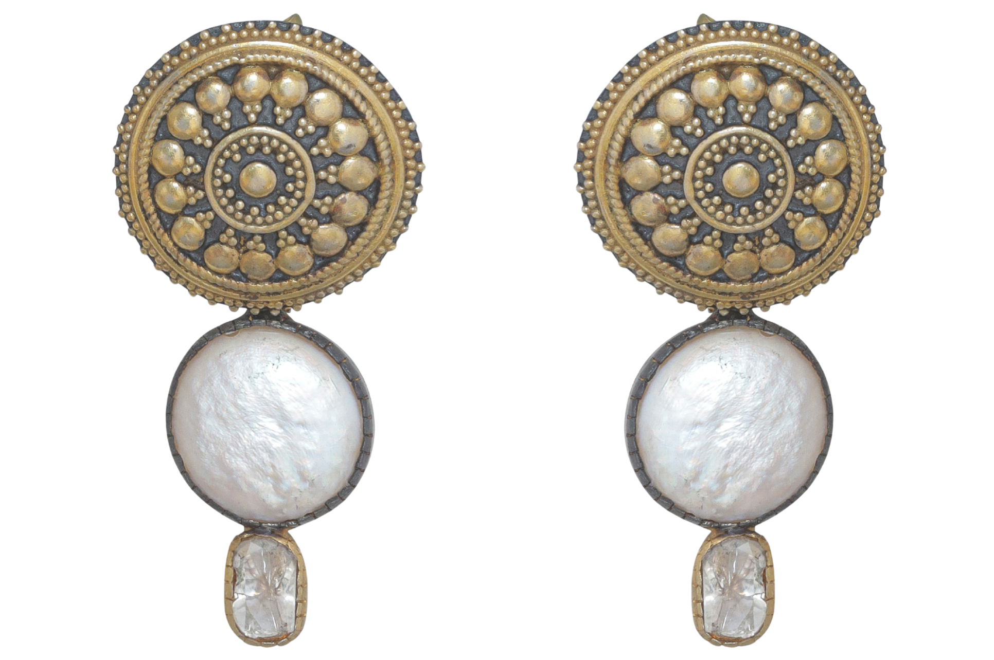 These unique earrings have an ornate stud top with a gold and oxidised silver finish and are then set with pears and diamond slices.