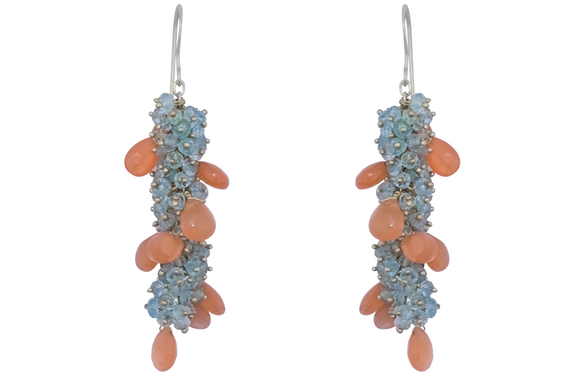 Intricately beaded jewellery - one of our most favourite things. A feat of craft and patience, these earrings are a cluster of pale blue aquamarine gemstones, interspersed with carnelian gemstones.