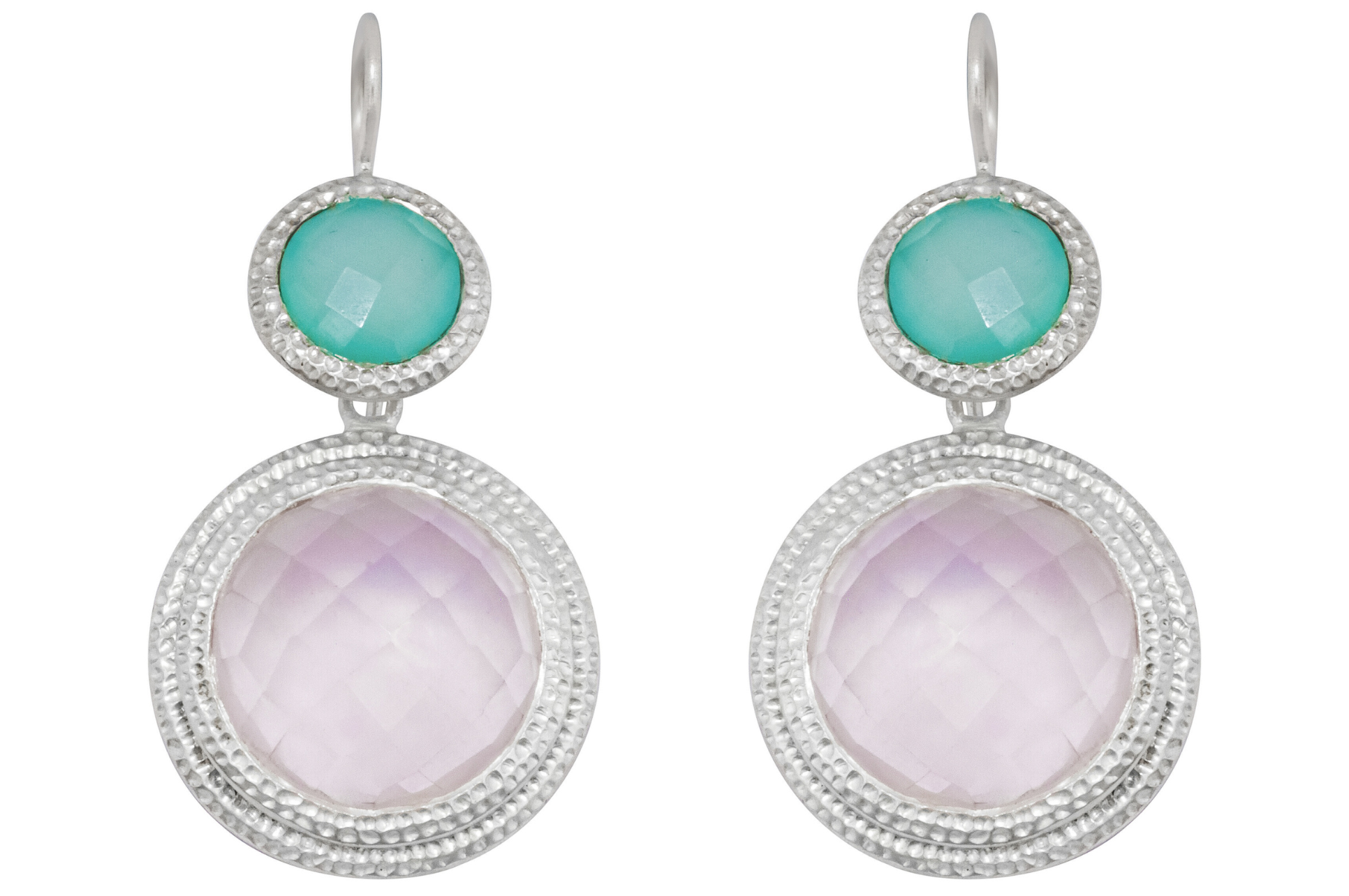 Gorgeous double drop, gemstone earrings set with pastel pink rose quartz and duck egg blue chalcedony. The gemstones are off set by a textured finish on the setting, a subtle hammered finish.