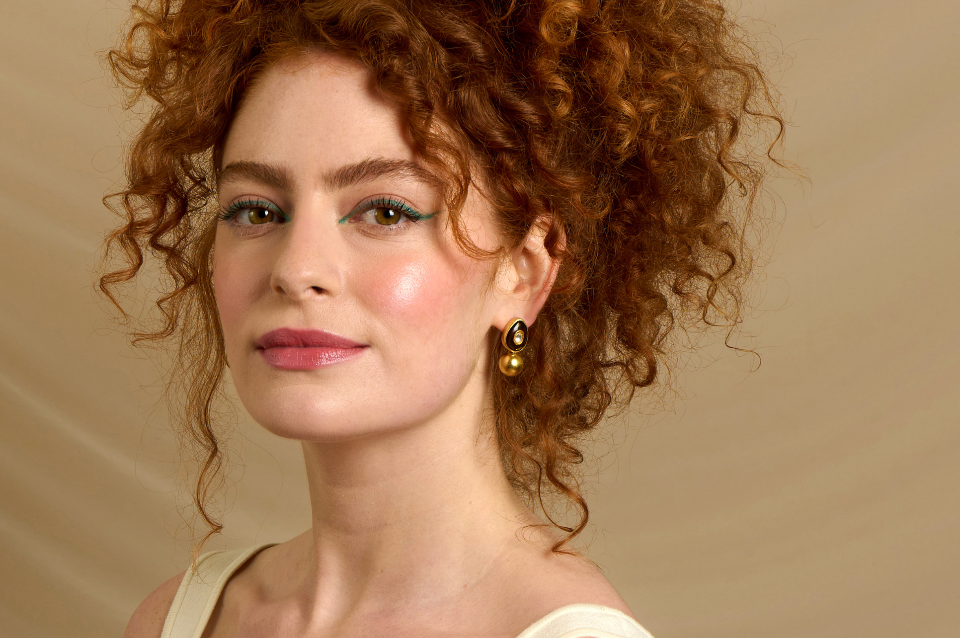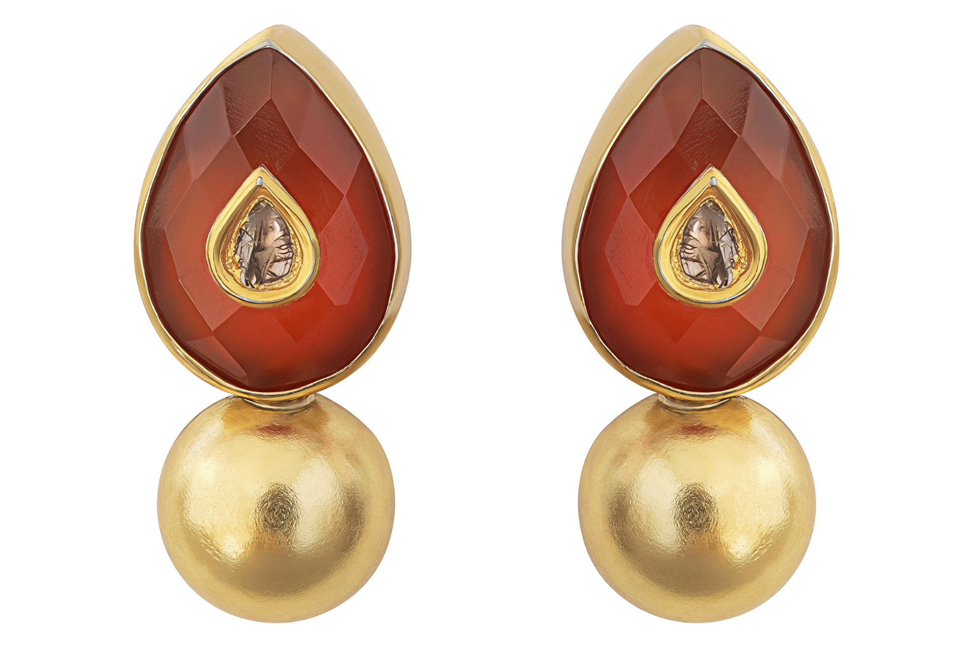 These earrings incorporate carnelian gemstones inset with diamonds and with a suspended golden ball.   Unique, hand-crafted creations.   Ellie wears a version of this design set with smoky quartz gemstones.