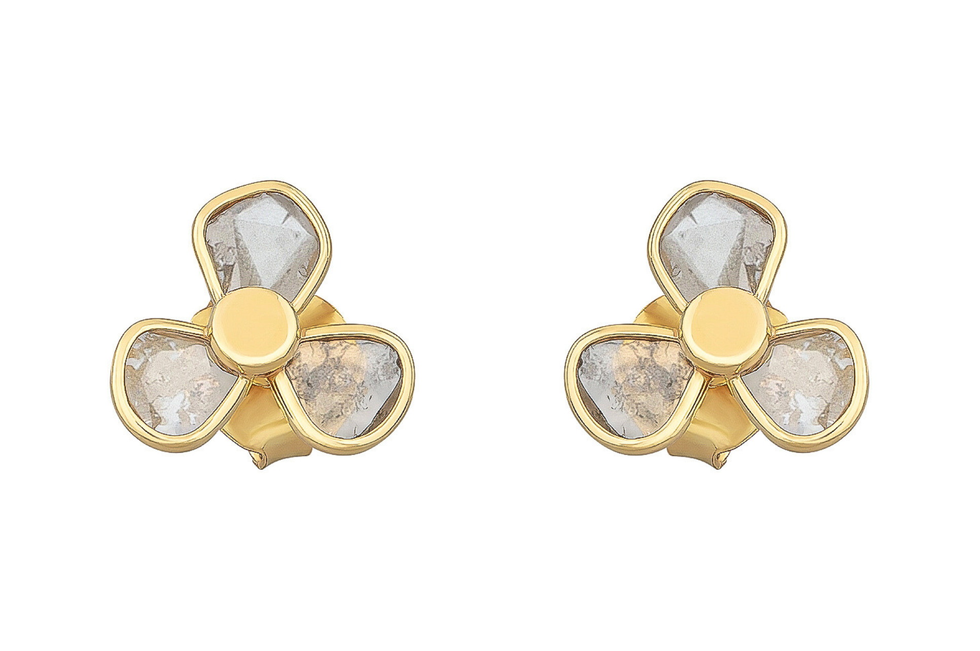 Shimmering stud earrings set with three diamond slices.