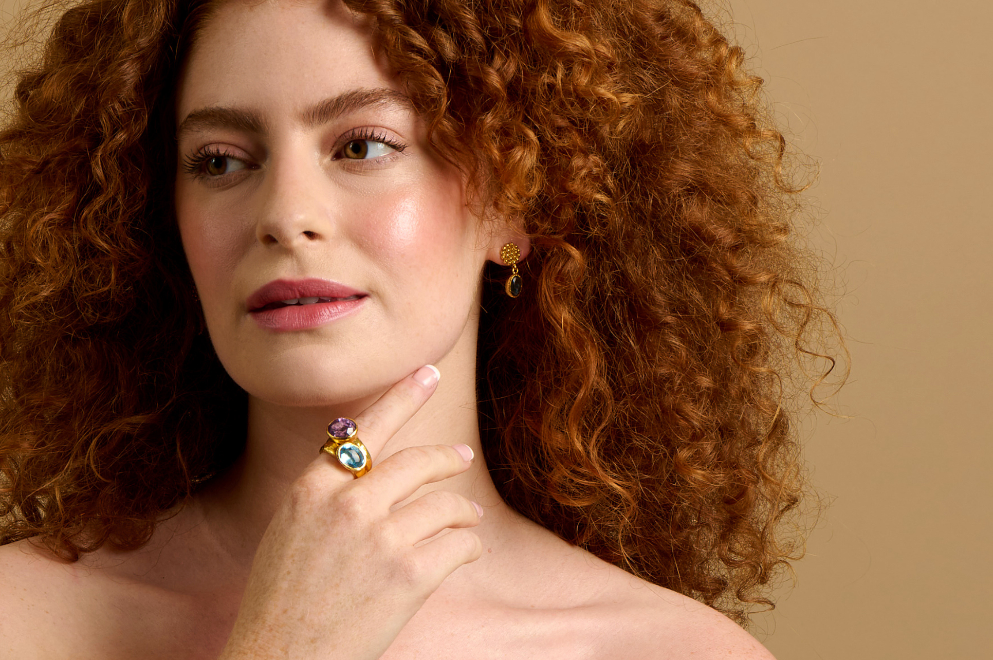 One of the latest rings from our India Ring Collection, featuring vibrant, coloured gemstones encased in precious metals. All of these rings are unique, incorporating free size gemstones and bespoke settings.