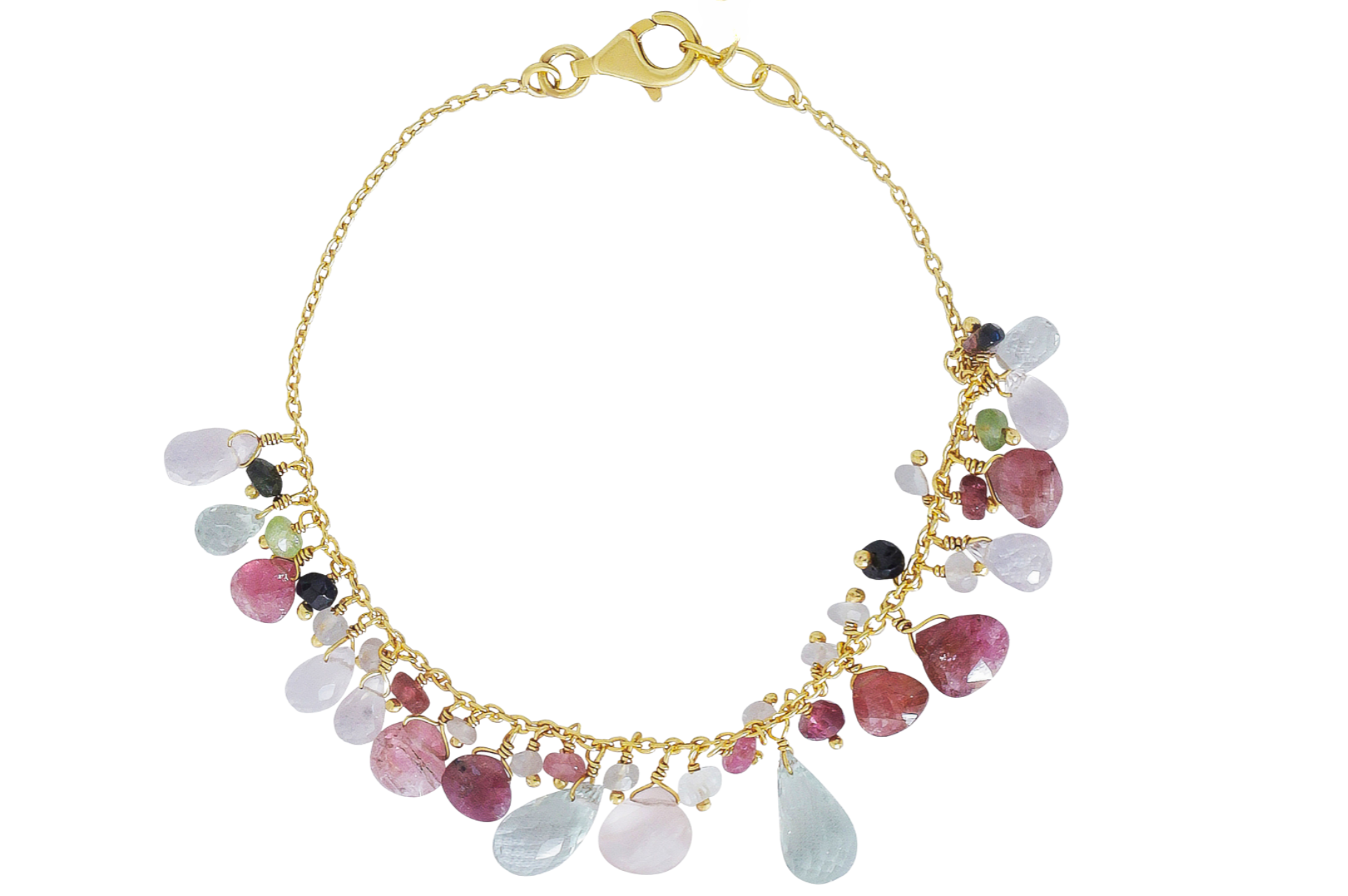 Materials: the bracelet is made of gold plated sterling silver and is beaded with green amethyst, rose quartz & tourmaline gemstones.