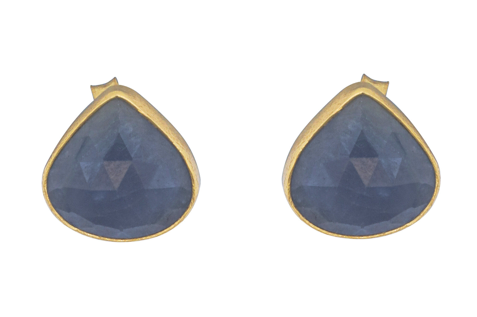 Beautiful gemstone stud earrings set with deep blue sapphires.  The gemstones are pear-shaped, faceted and are set in a complimentary gold bezel setting.