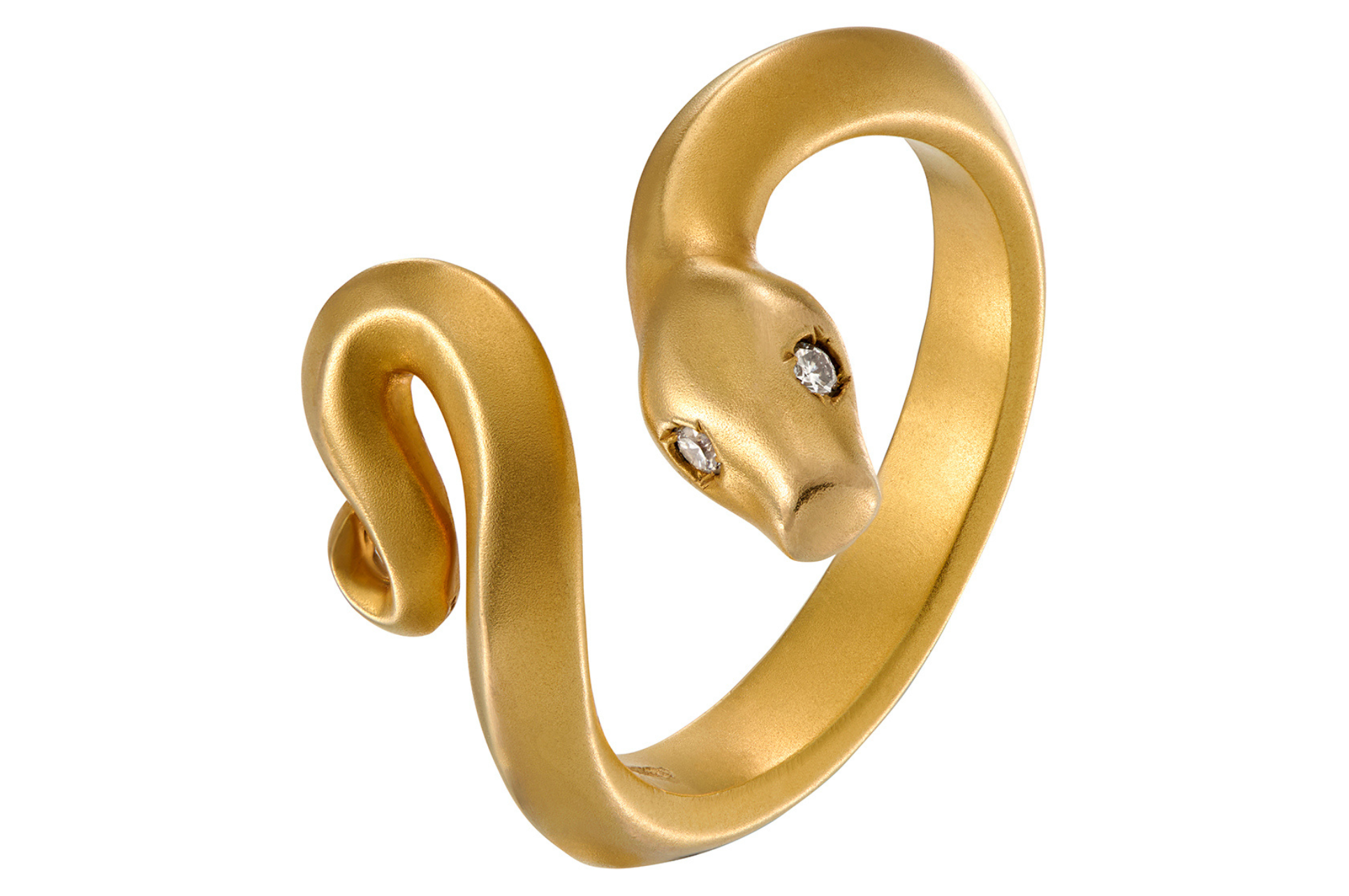 A pleasingly formed ring made in solid 18K gold. This snake ring has two diamond-set eyes and a subtle matt finish applied to the gold. Ellie wears this ring with our Fine Gold & Emerald Bead Necklace.
